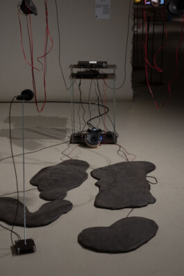 The installation consists of 7 tracks. By placing a finger on the sensor, the measured heart frequency of the listener determines which and how each composition is activated.